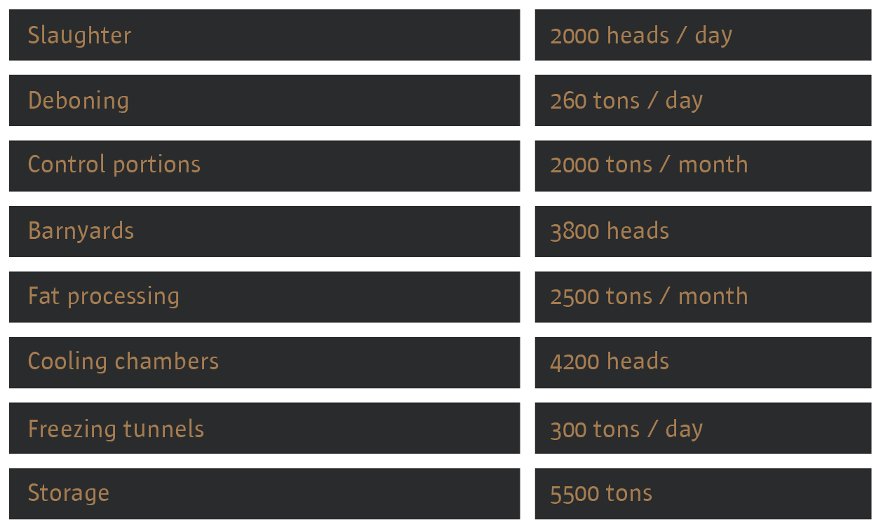 Being one of the largest beef packing operations in the country, its current production facility includes a plant located in the province of Buenos Aires with a processing capacity of 1.800 heads per day.